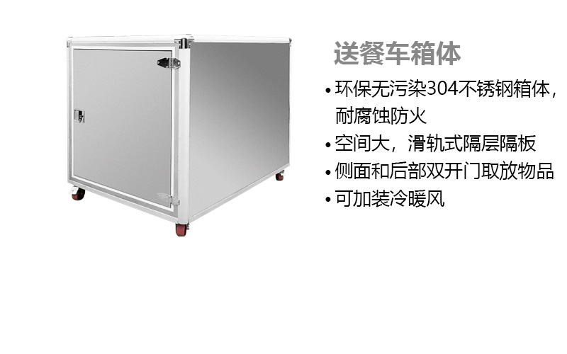 送餐車(chē)箱體特點(diǎn):箱體材料采用環(huán)保無(wú)污染 304不銹鋼材料,具有耐腐蝕防火特點(diǎn)??臻g大,滑軌式隔層隔板。 側面和后部雙開(kāi)門(mén)方便用戶(hù)取放物品??杉友b冷暖風(fēng)。